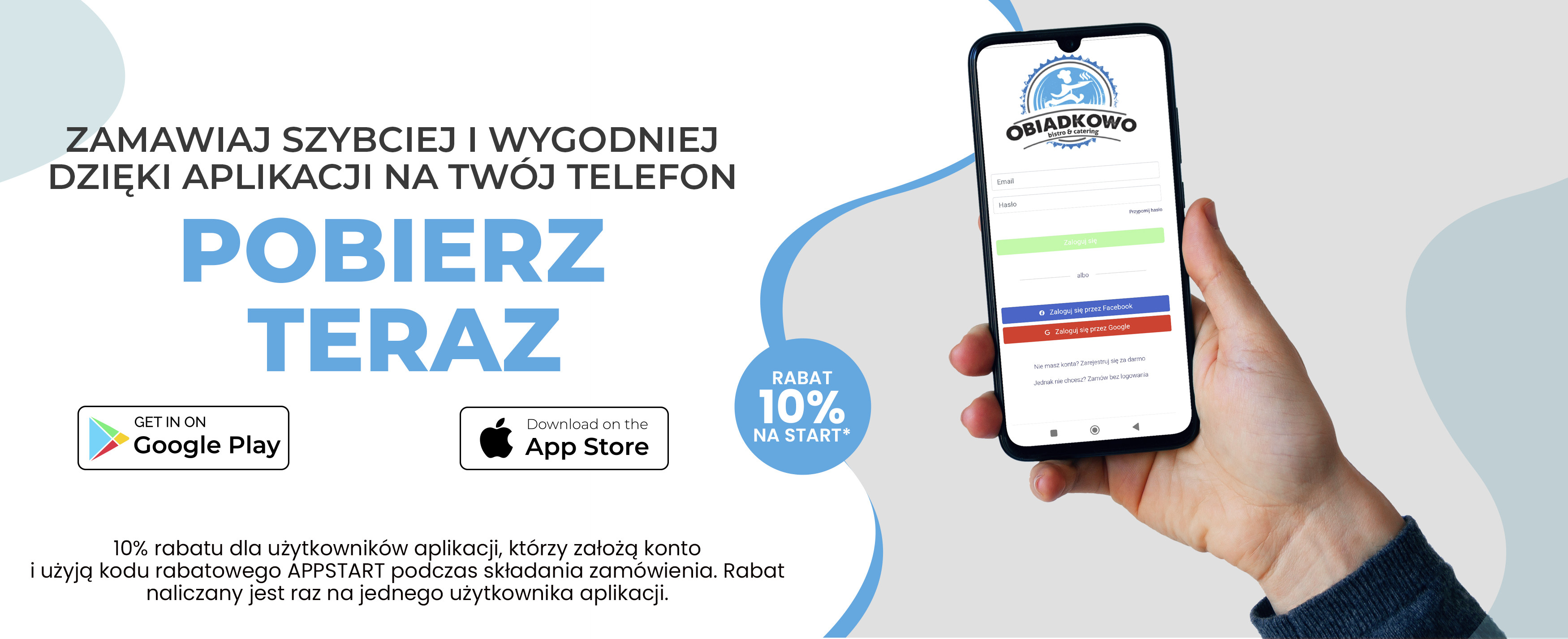 Każdy nowy użytkownik aplikacji może skorzystać z rabatu powitalnego w wysokości -10% na całe zamówienie.